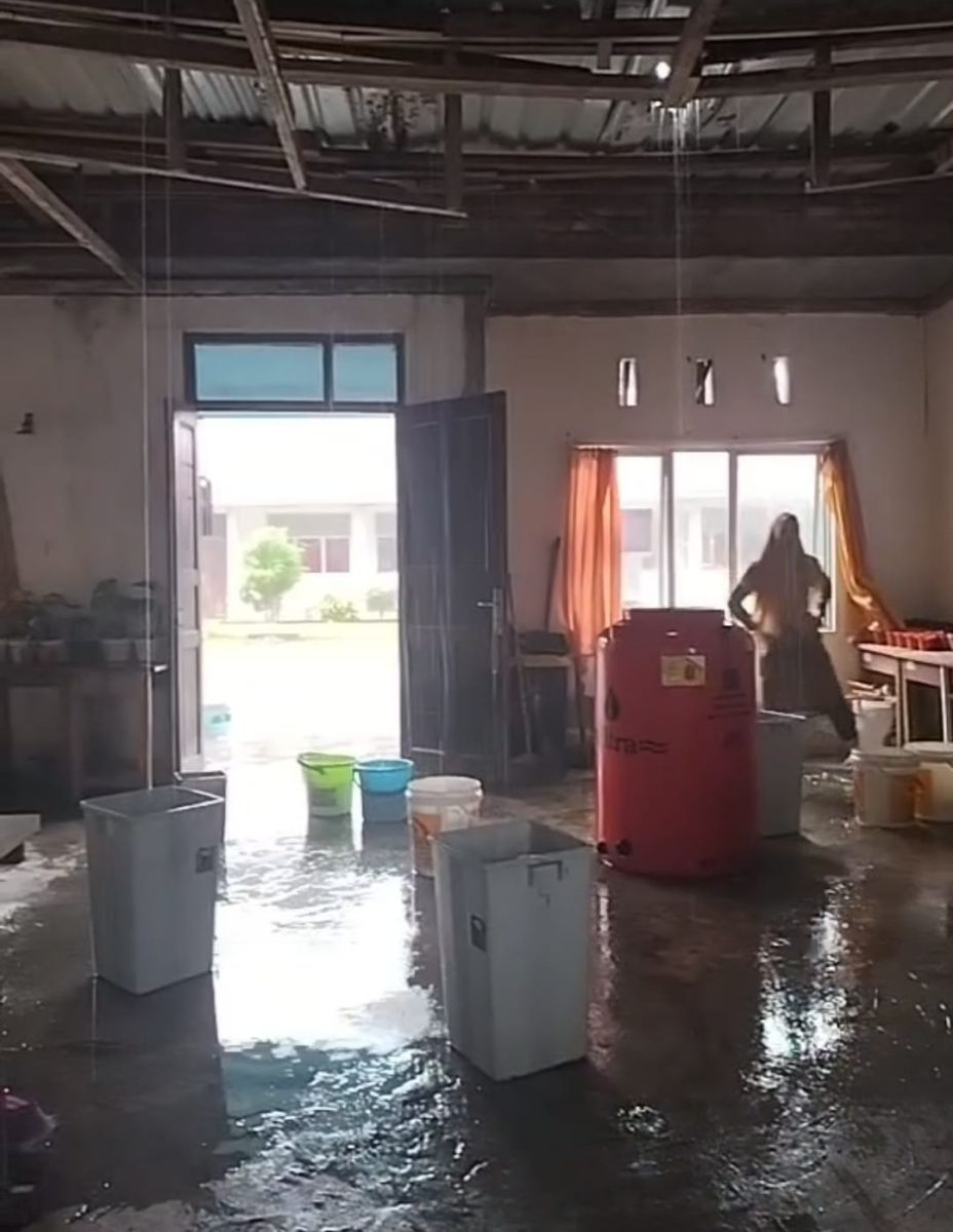 Pantauan di lokasi menunjukkan plafon ruang guru rusak parah dan lapuk dimakan usia. Air menggenang di lantai setiap kali hujan, dan beberapa meja ditutupi plastik agar tidak basah.
